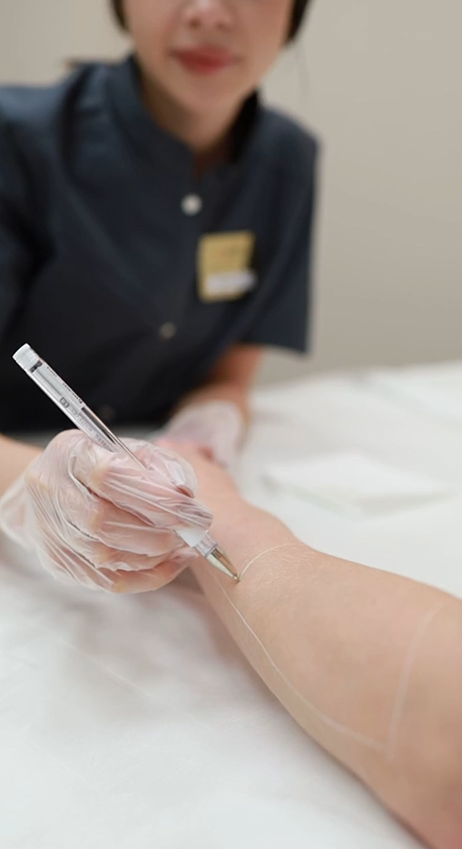 Участок с татуировкой не обрабатывается — специалист закрывает тату пластырем и обходит его, защищая кожу.